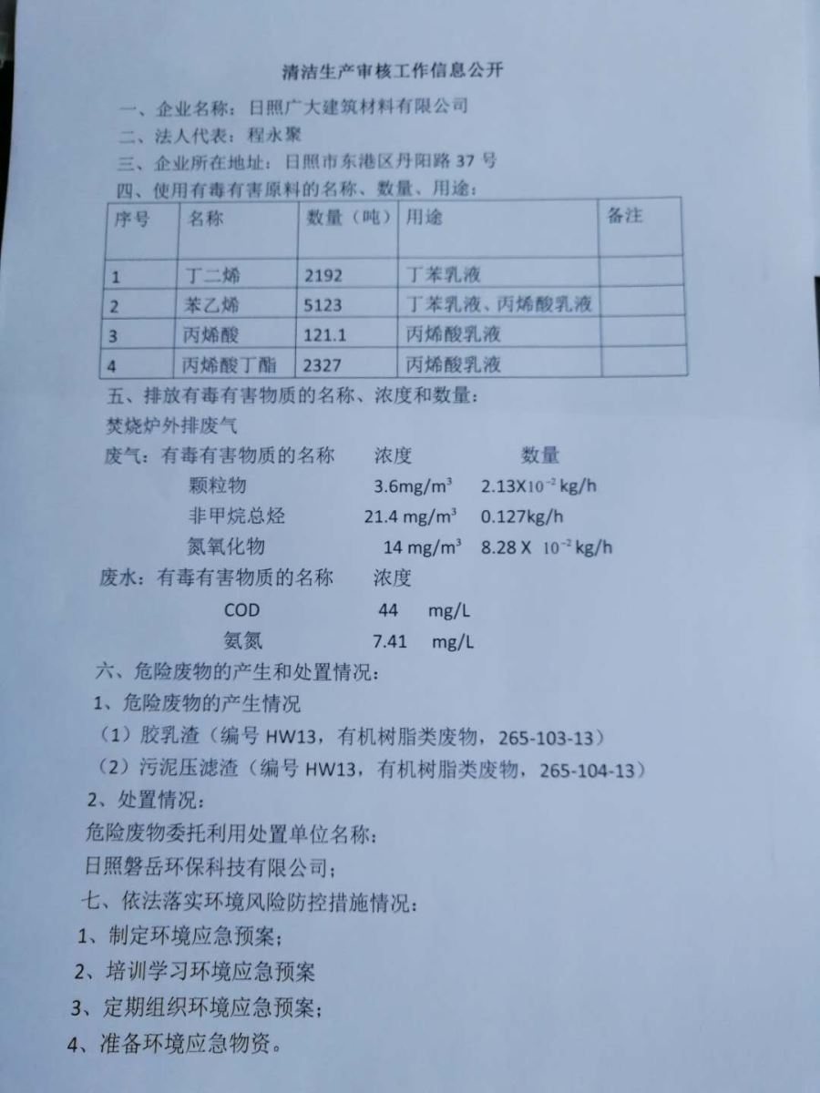 日照廣大建筑材料有限公司,位于風景秀麗的海濱城市山東日照,成立于1988年,是專業(yè)生產高分子化工產品,集科研開發(fā)、生產經營為一體的化工企業(yè),主要產品為丙烯酸脂類乳液和丁苯膠乳。是國內目前江北同行業(yè)產銷量最大企業(yè)之一。